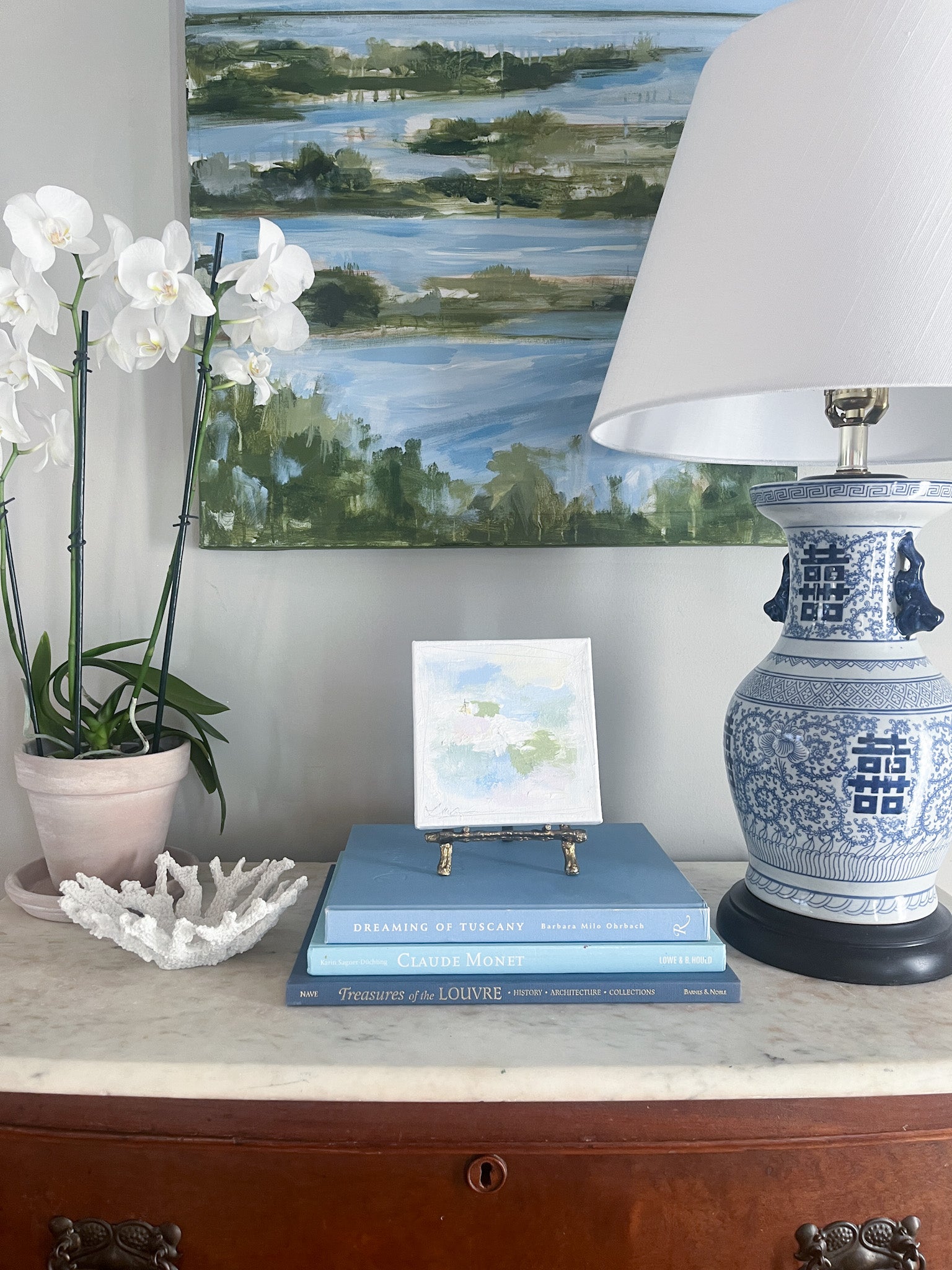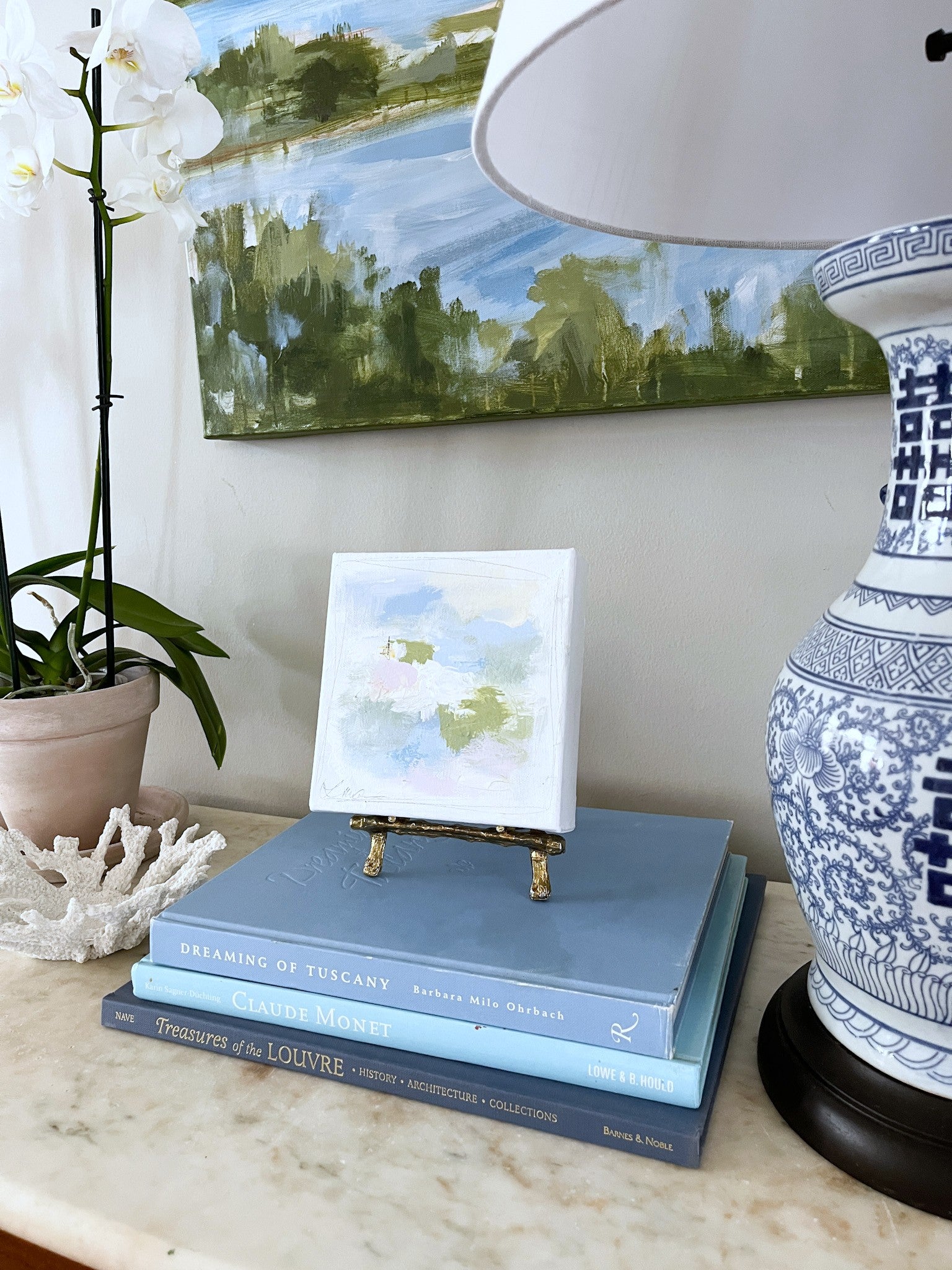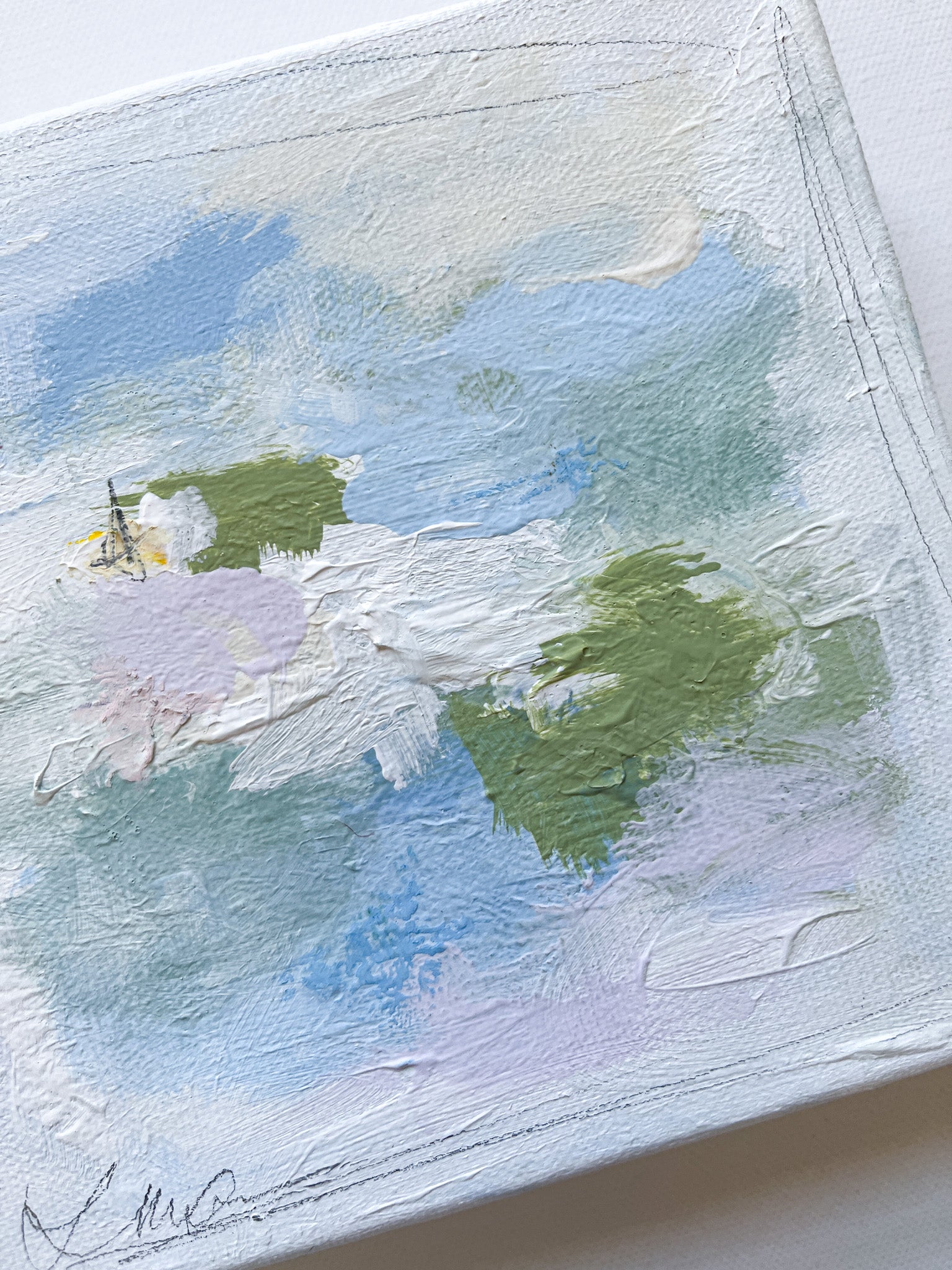 Mixed media (acrylic, oil and graphite) on 6x6 gallery wrapped block canvas. Signed on front corner, titled and signed on back.