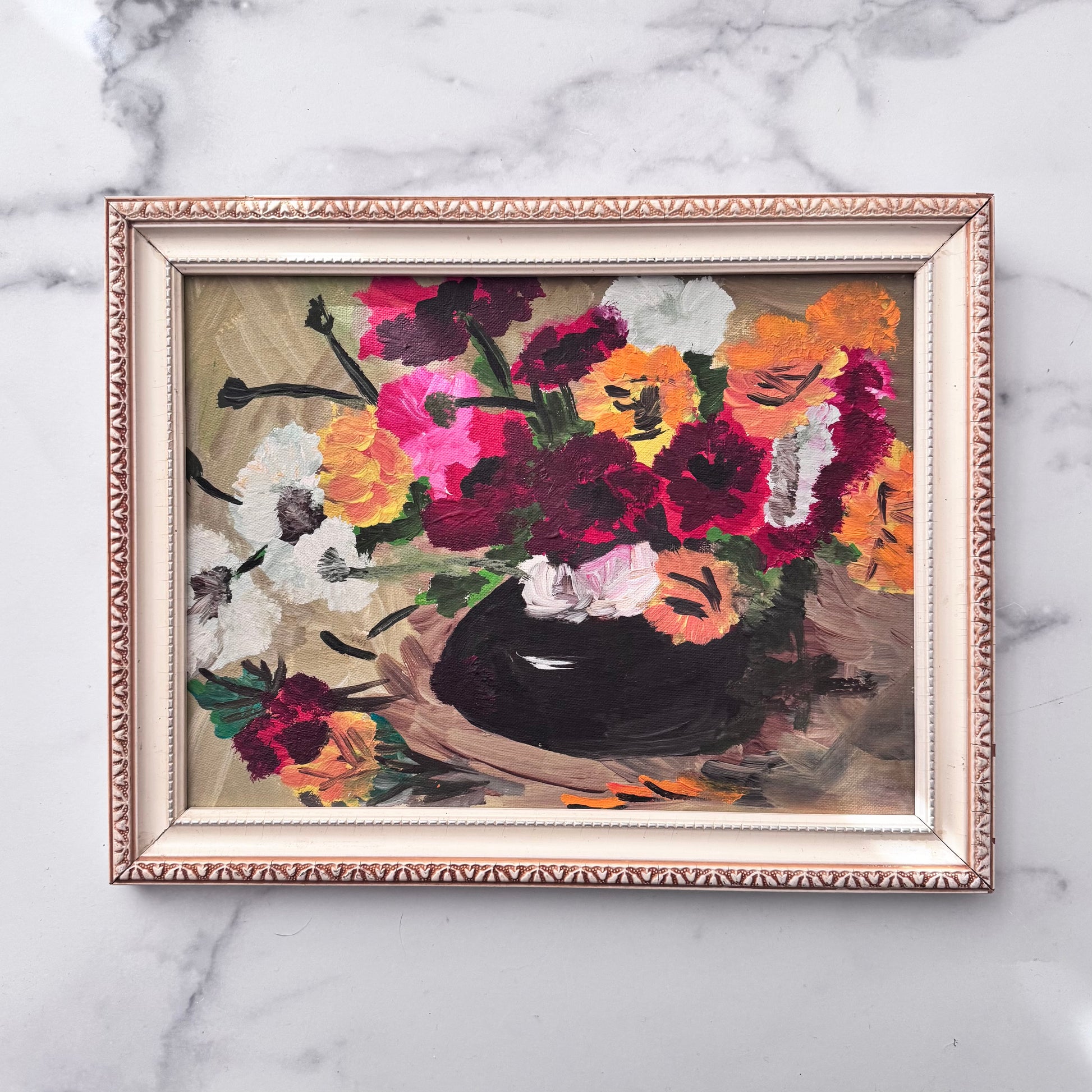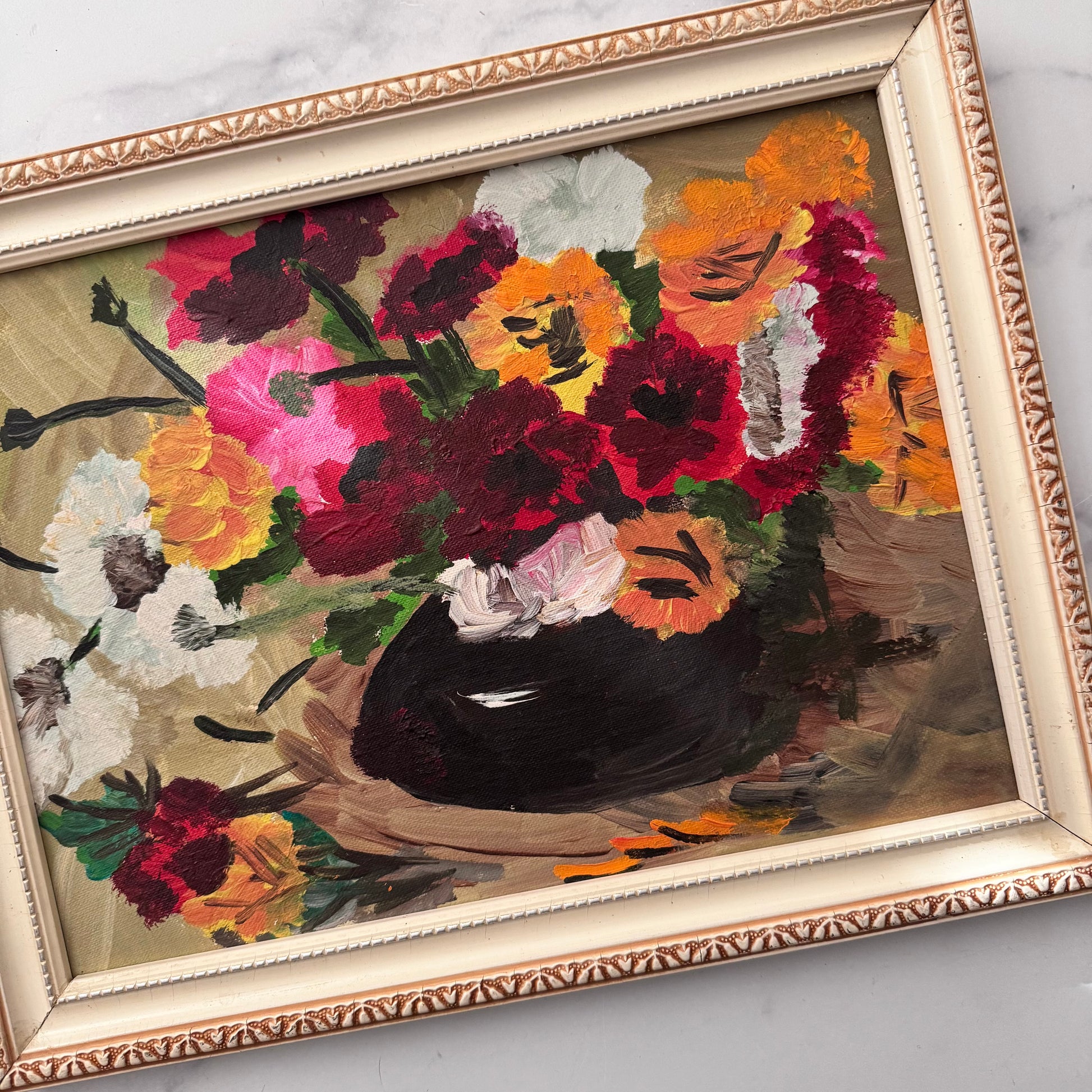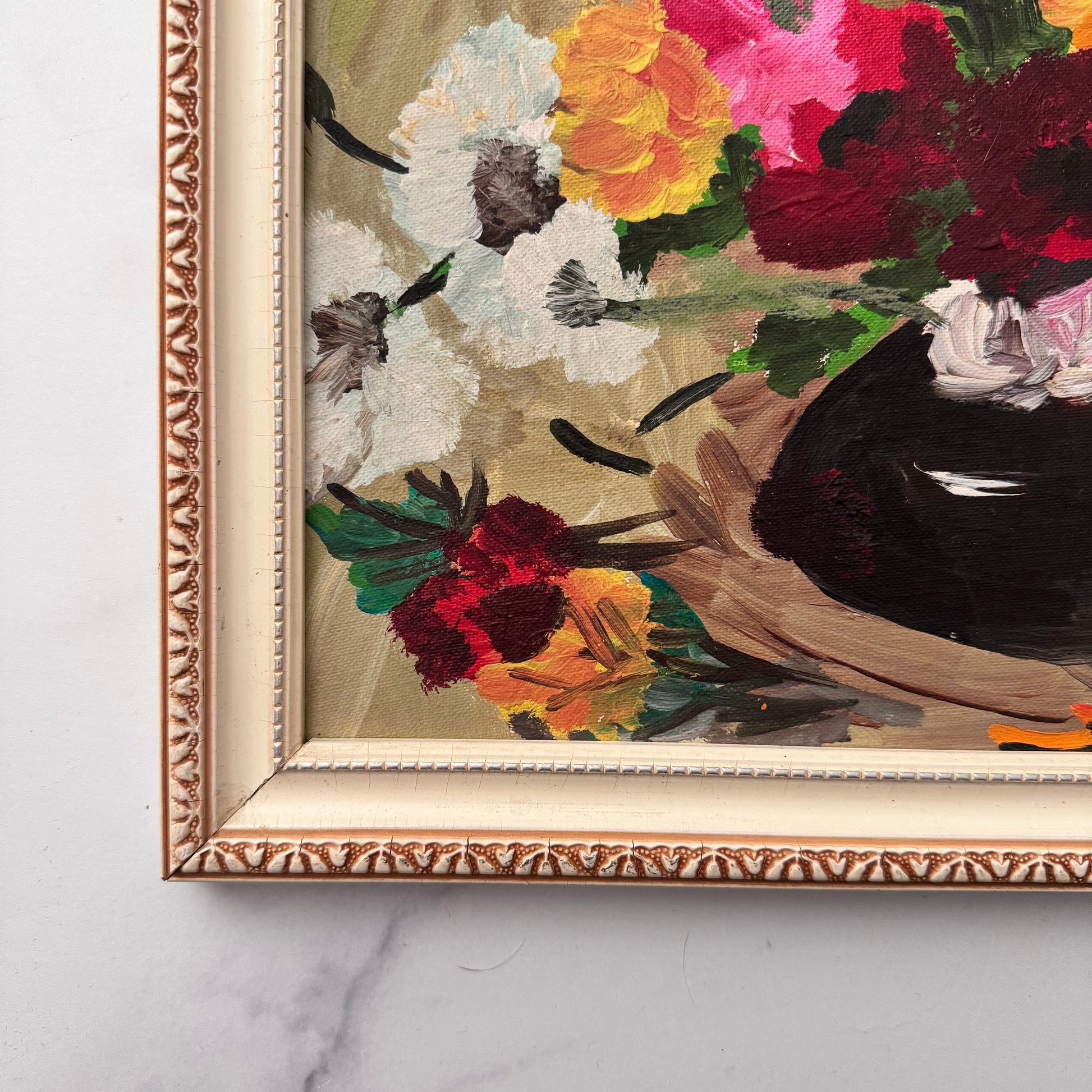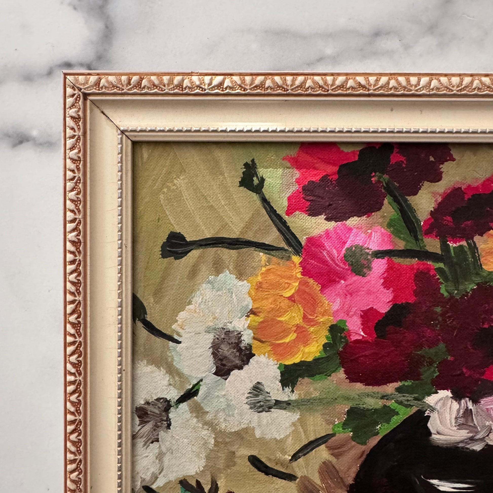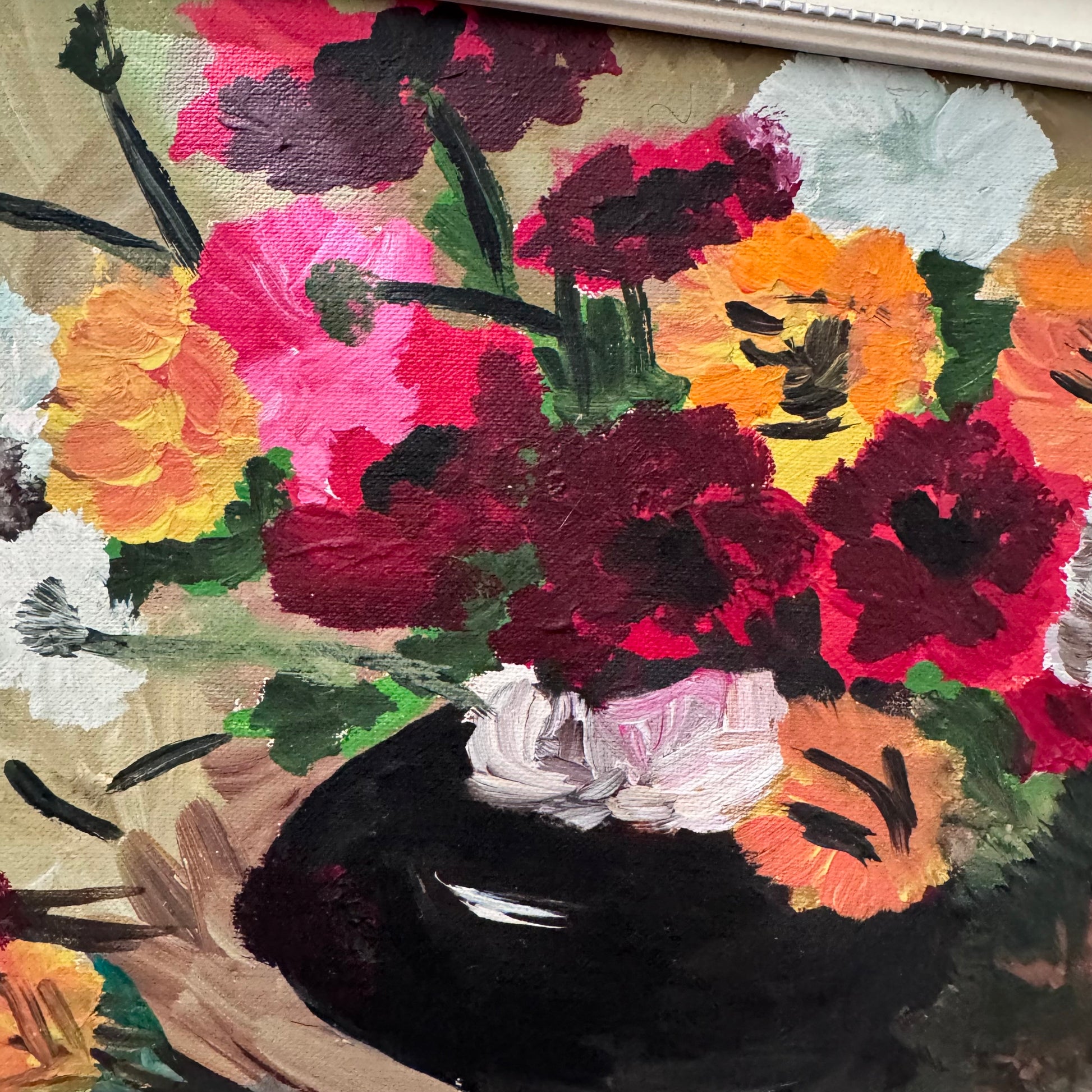 A cheerful and lively vintage painting of bright flowers in a black vase. The single pink flower draws our eye into the closely cropped energetic arrangement of what seems to be anenome flowers, symbols of luck and anticipation.