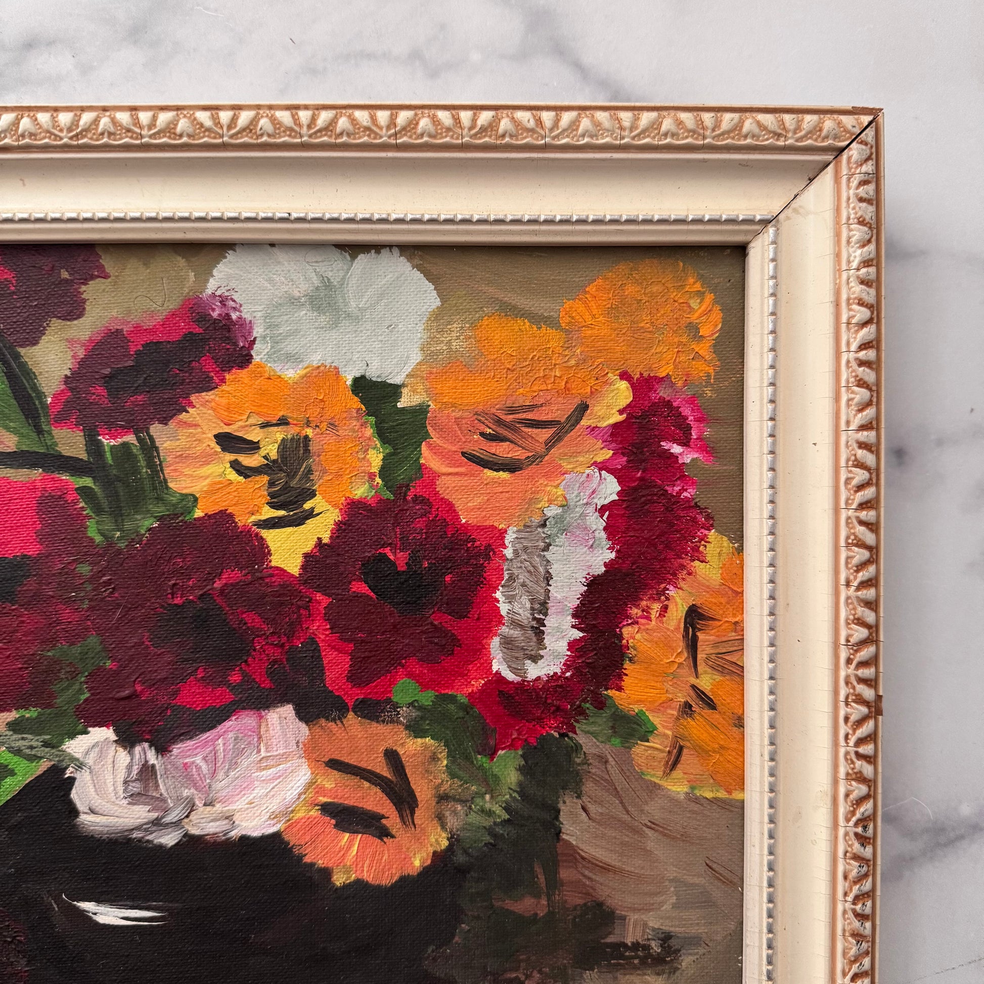 Cream wood frame with raised floral and silver beaded details