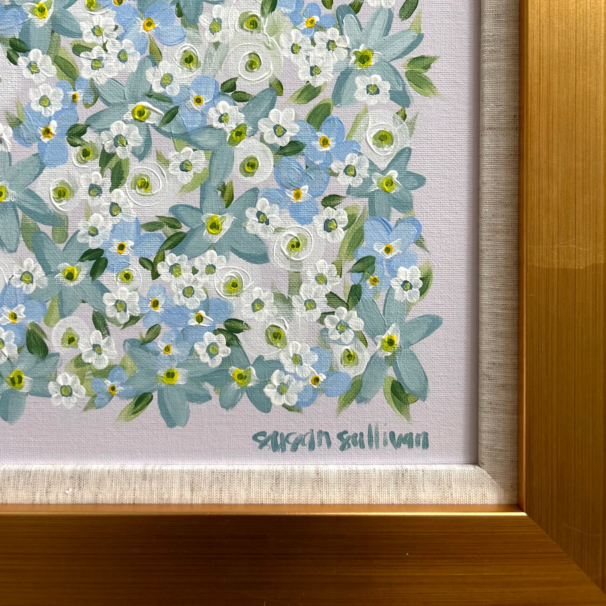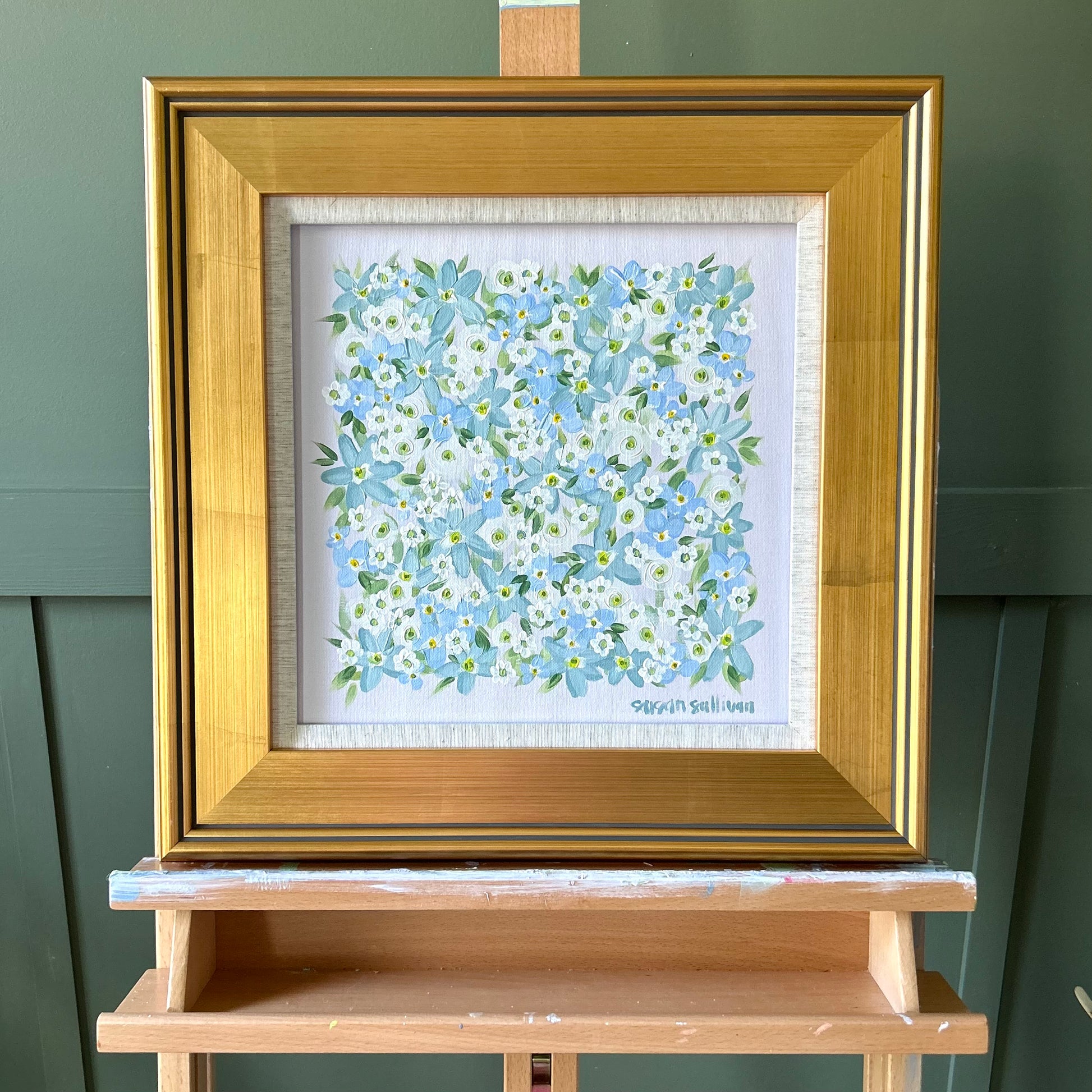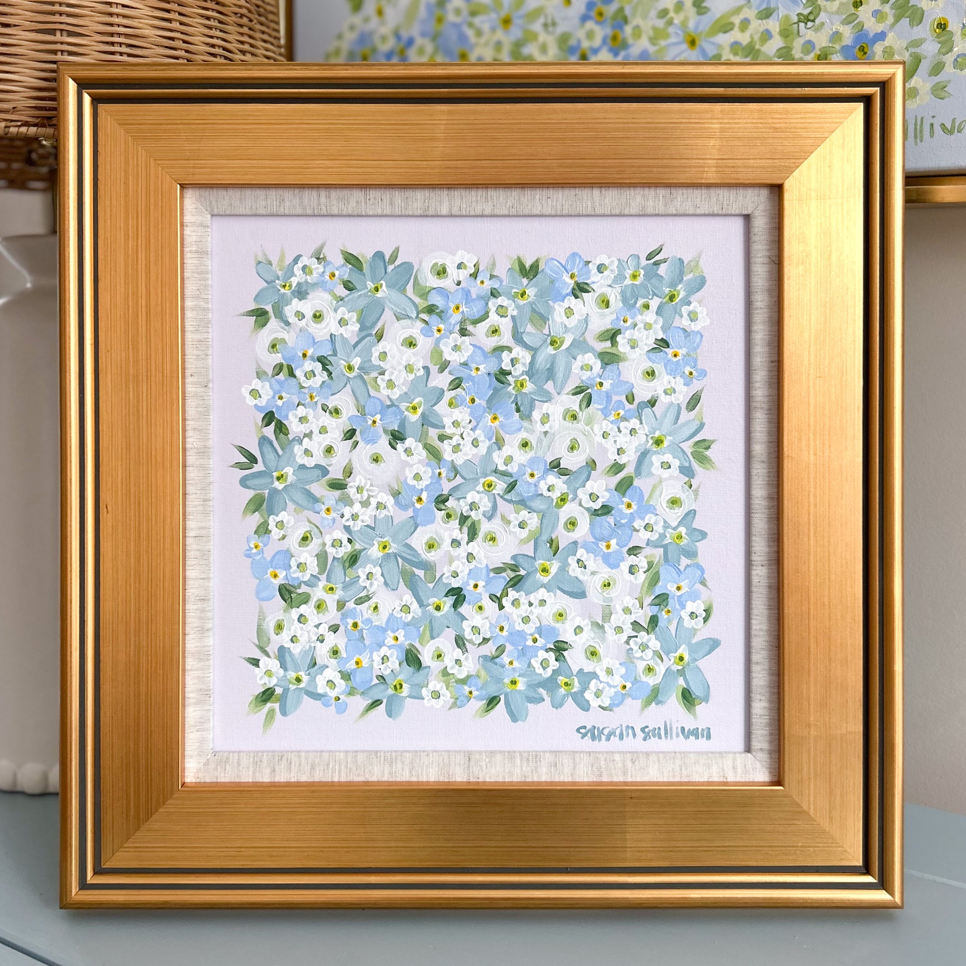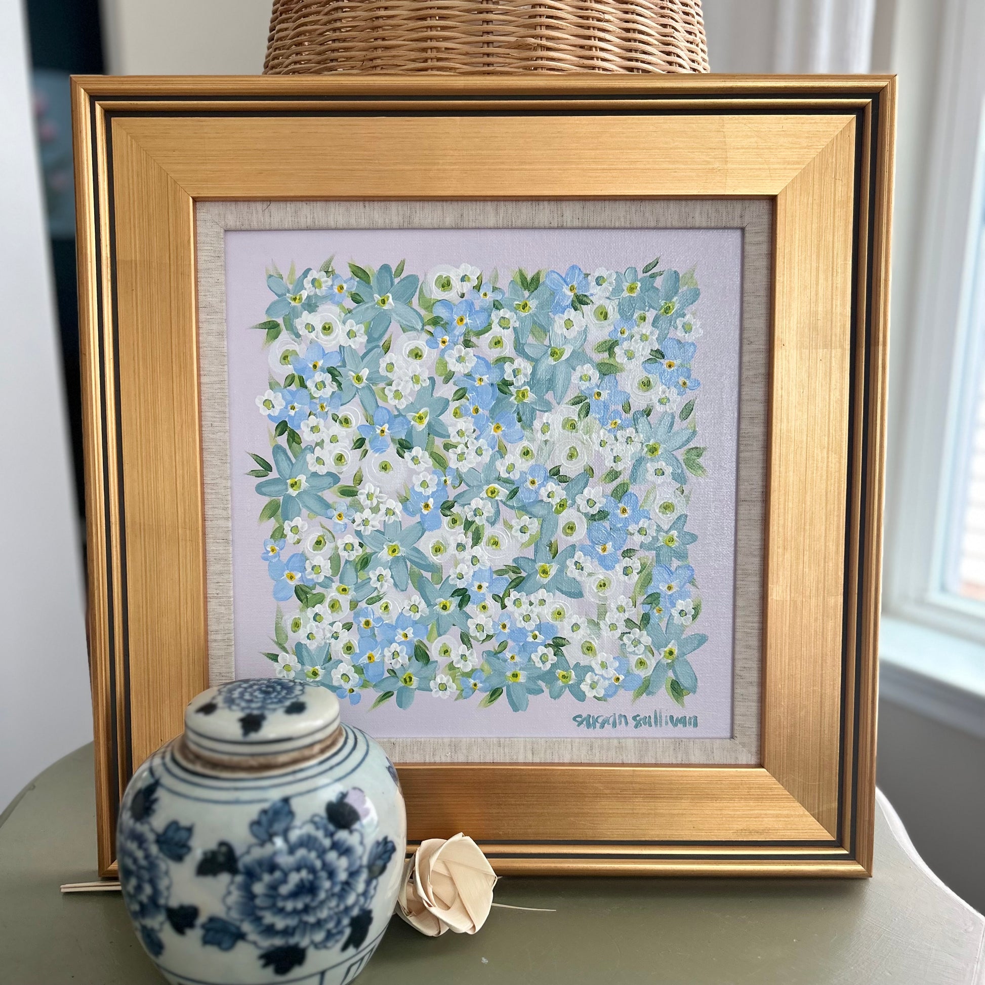 Gold wood Plein Aire frame with linen liner adds 3” to each side, framed dimensions are 18x18”