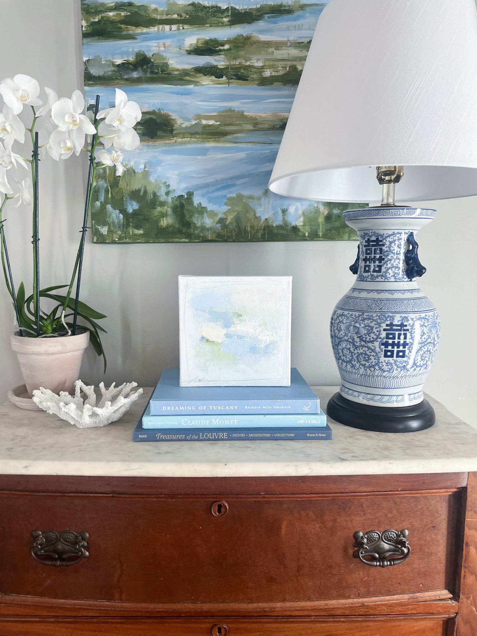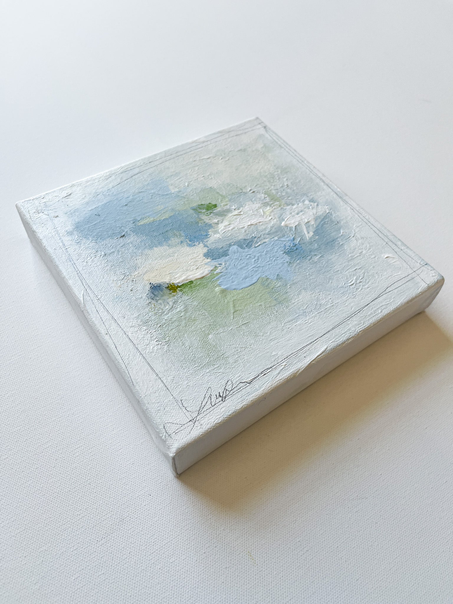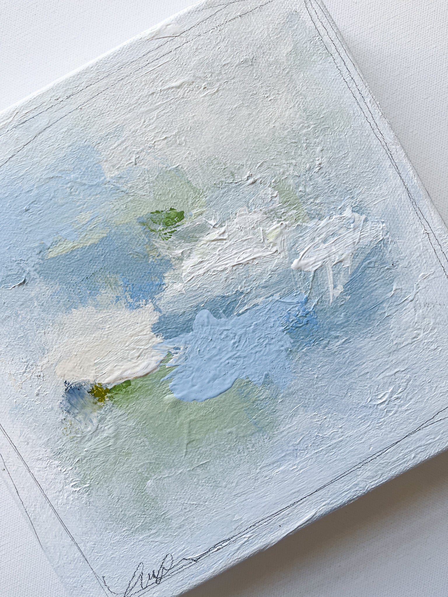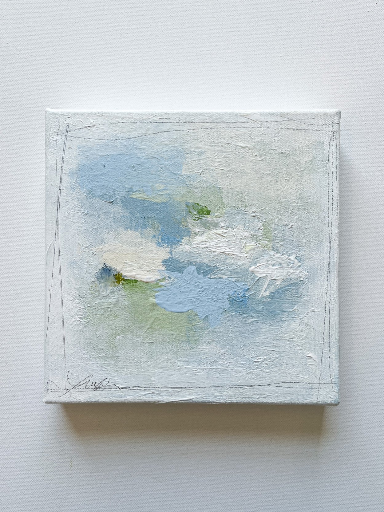 Mixed media (acrylic, oil and graphite) on 8x8 gallery wrapped block canvas. Signed on front corner, titled and signed on back.