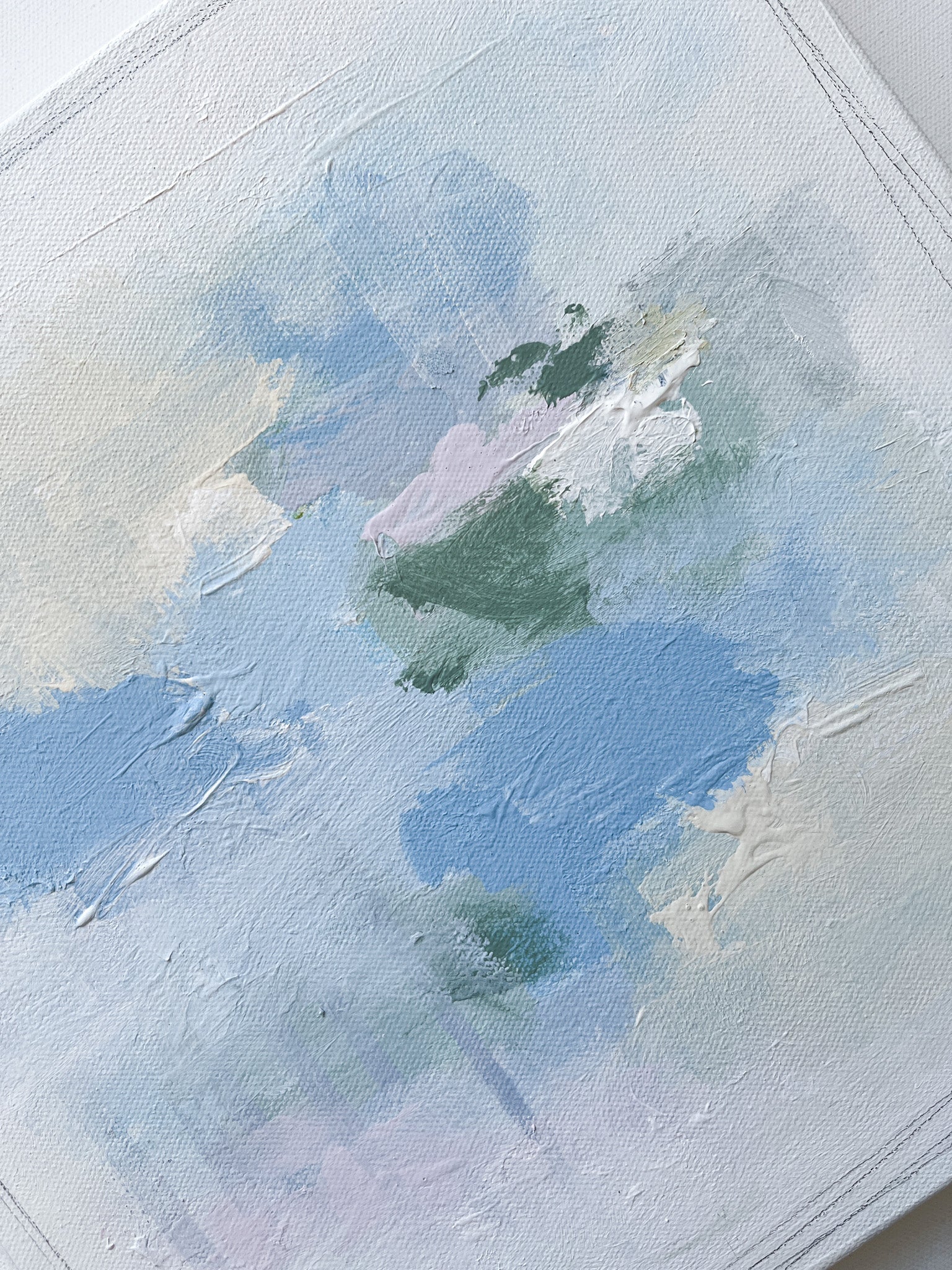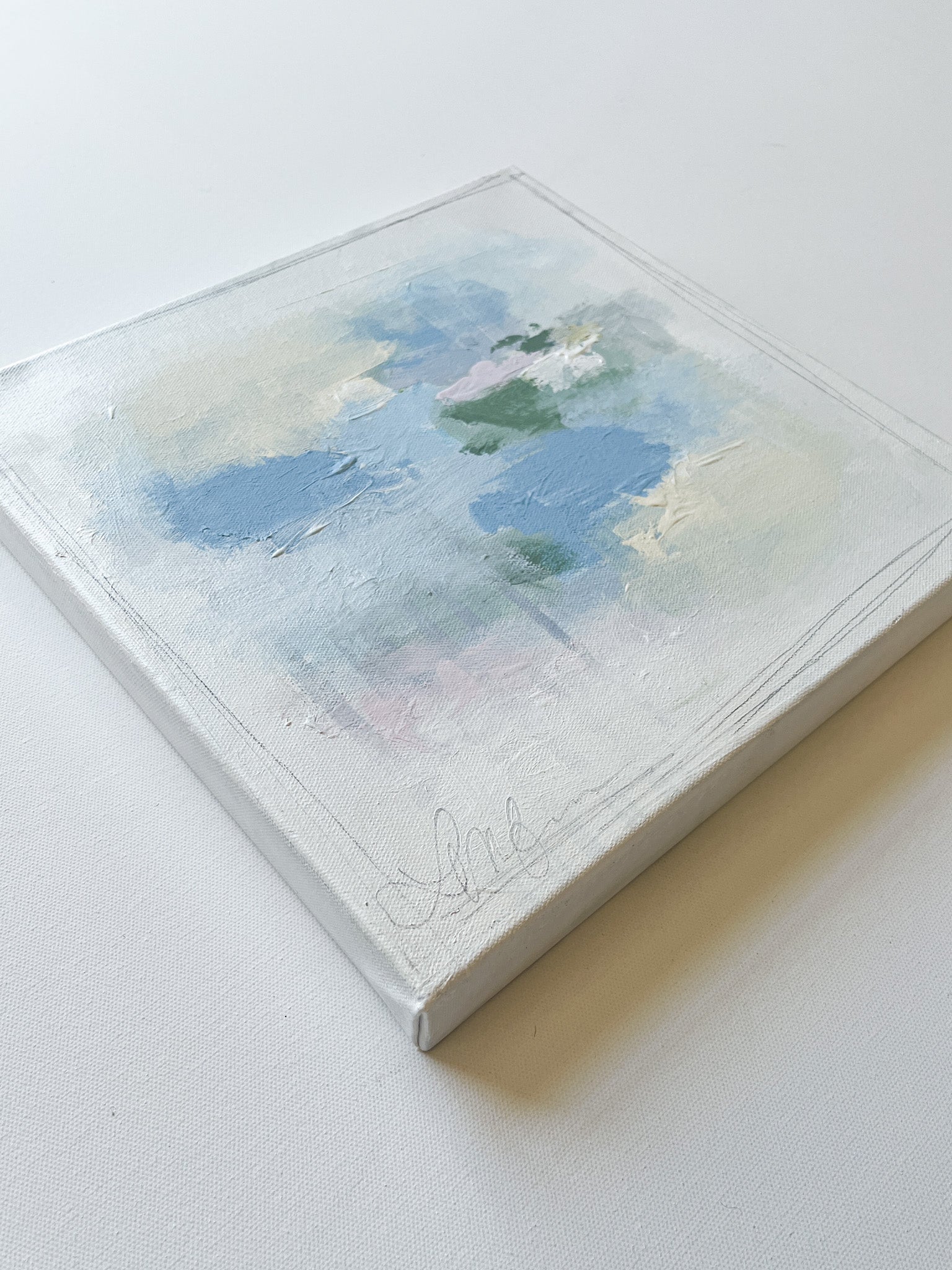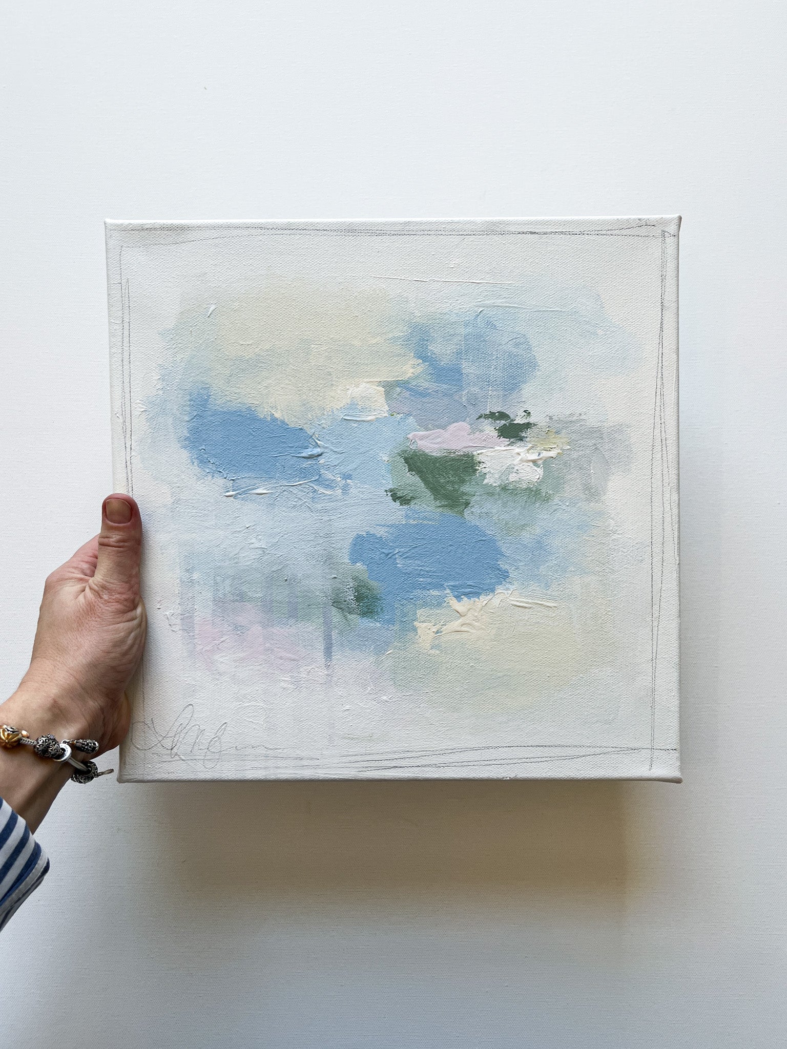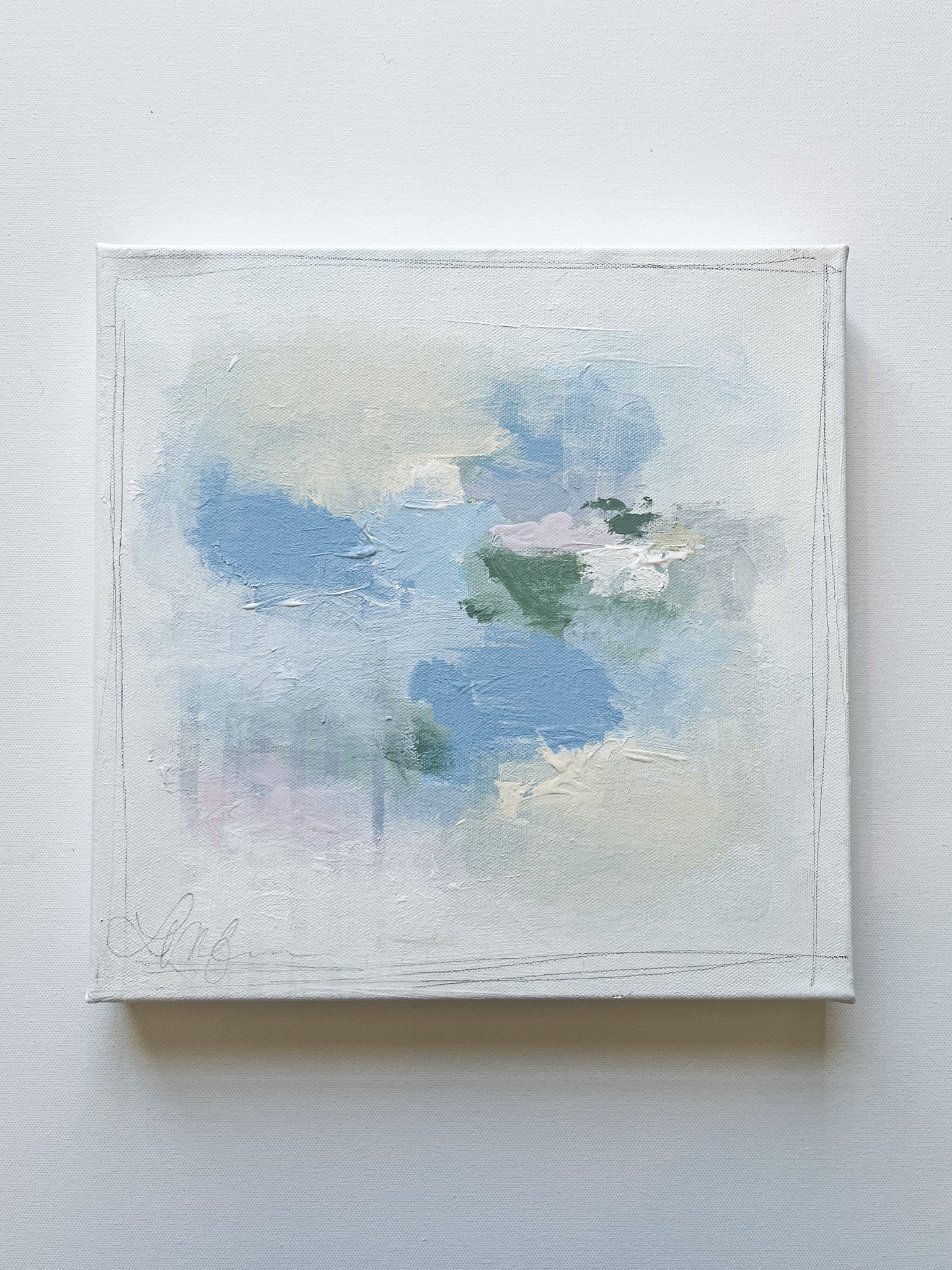 Mixed media (acrylic, oil and graphite) on 12x12 gallery wrapped canvas. Signed on front corner, titled and signed on back. Wired and ready to hang.