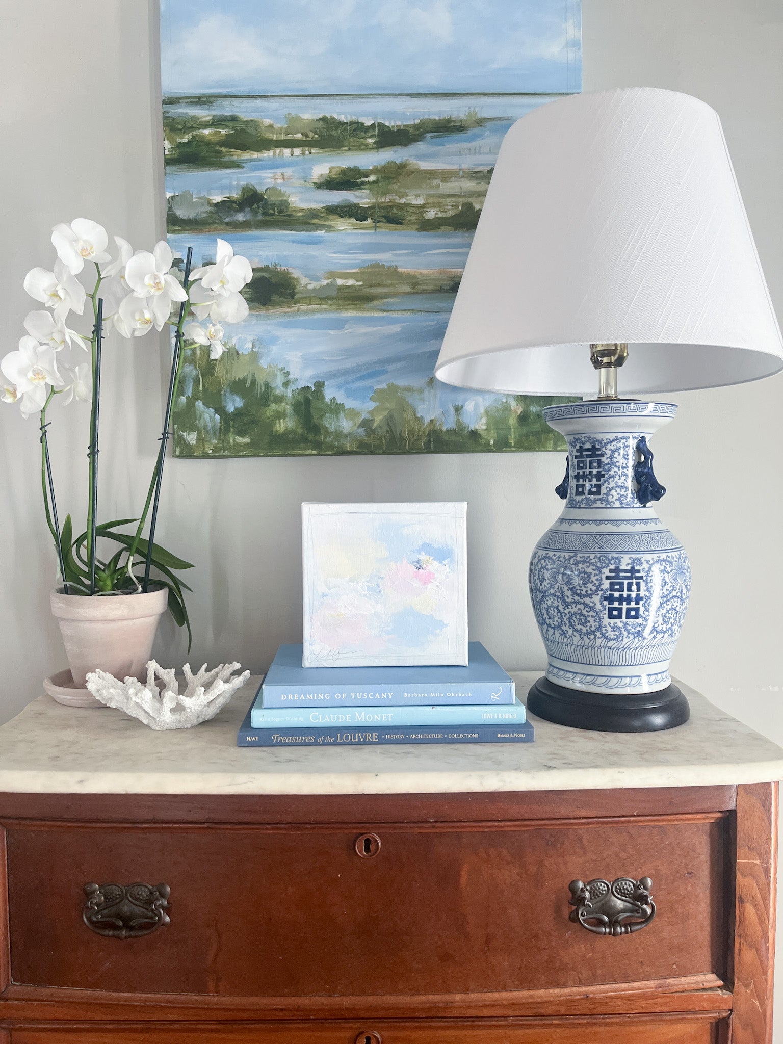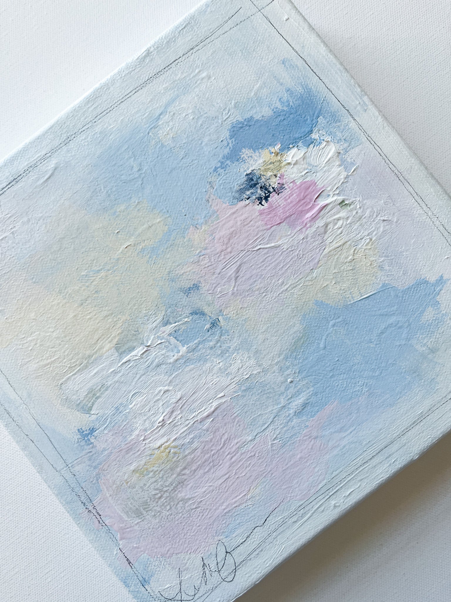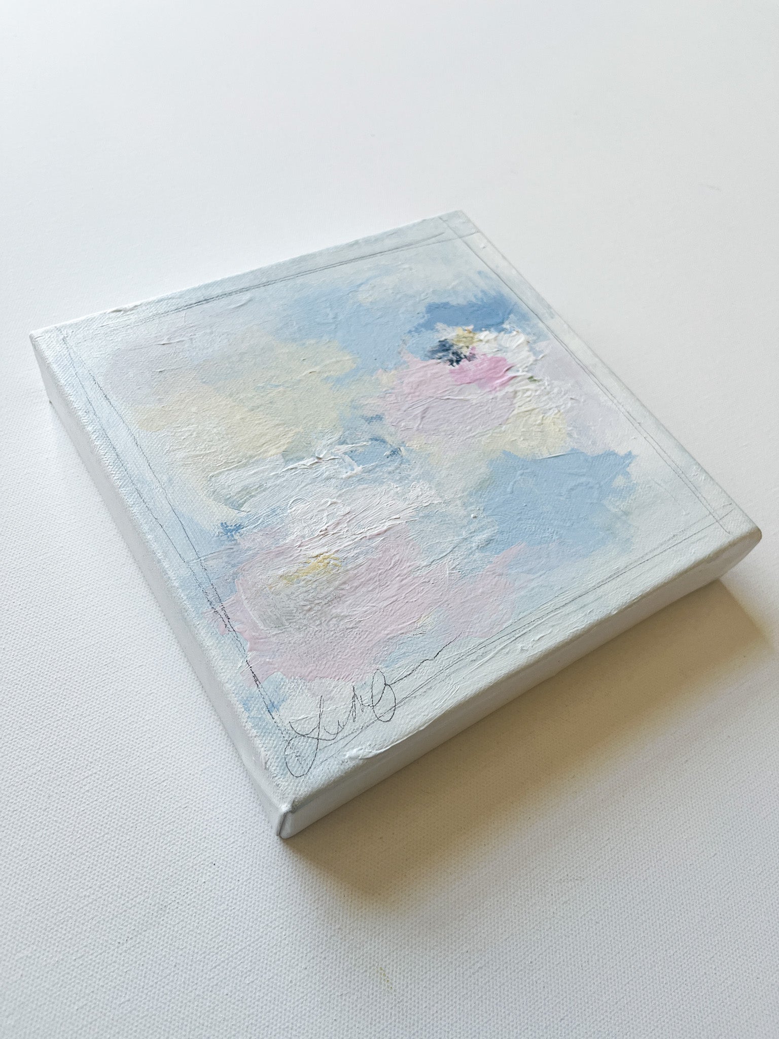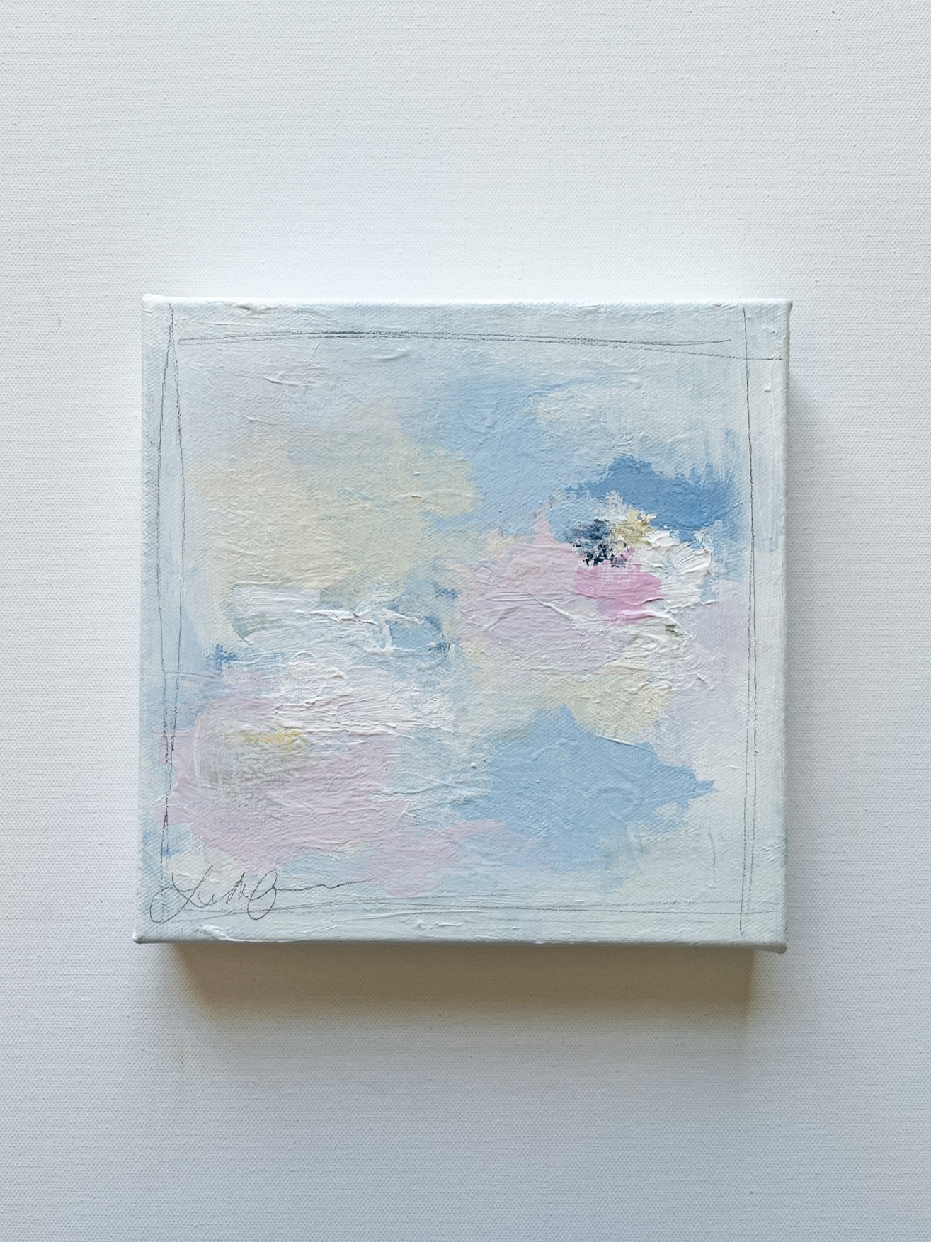 Mixed media (acrylic, oil and graphite) on 8x8 gallery wrapped block canvas. Signed on front corner, titled and signed on back.