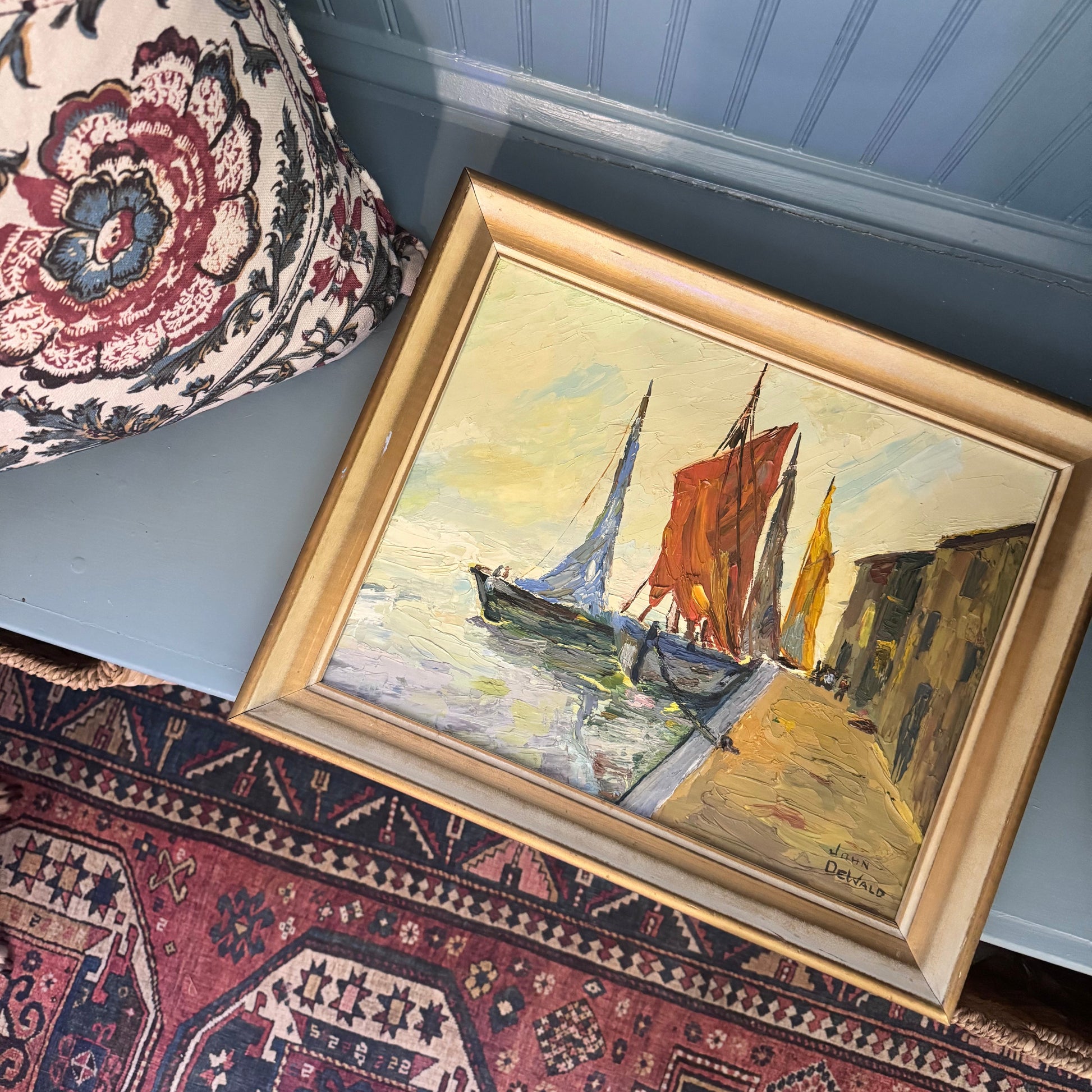 Vintage painting of sailboats at port. Heavy impasto texture laid down quickly with palette knives imbues the scene with the sense of being captured quickly in paint, a fleeting moment frozen in time. Oil on board, signed on front by artist John Dewald.