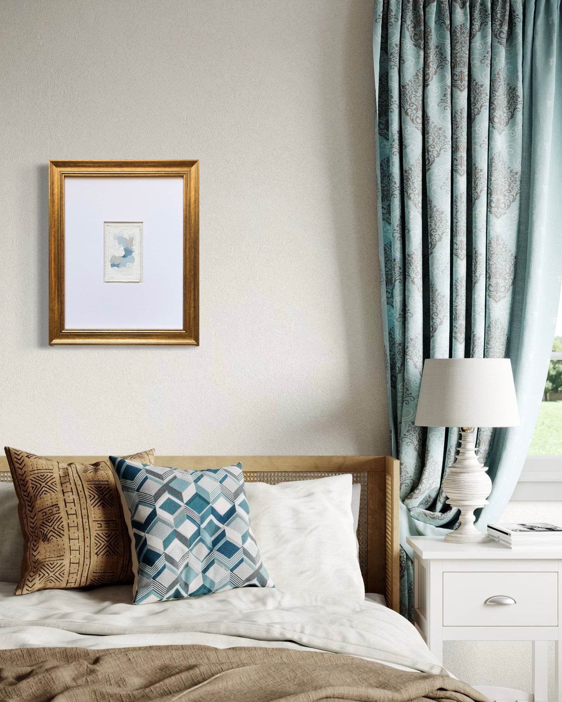 Details: Framed in vintage gold frame with glass front, matted on linen blend fabric in the color ivory, bright white 11x14 mat with 4x6 opening.