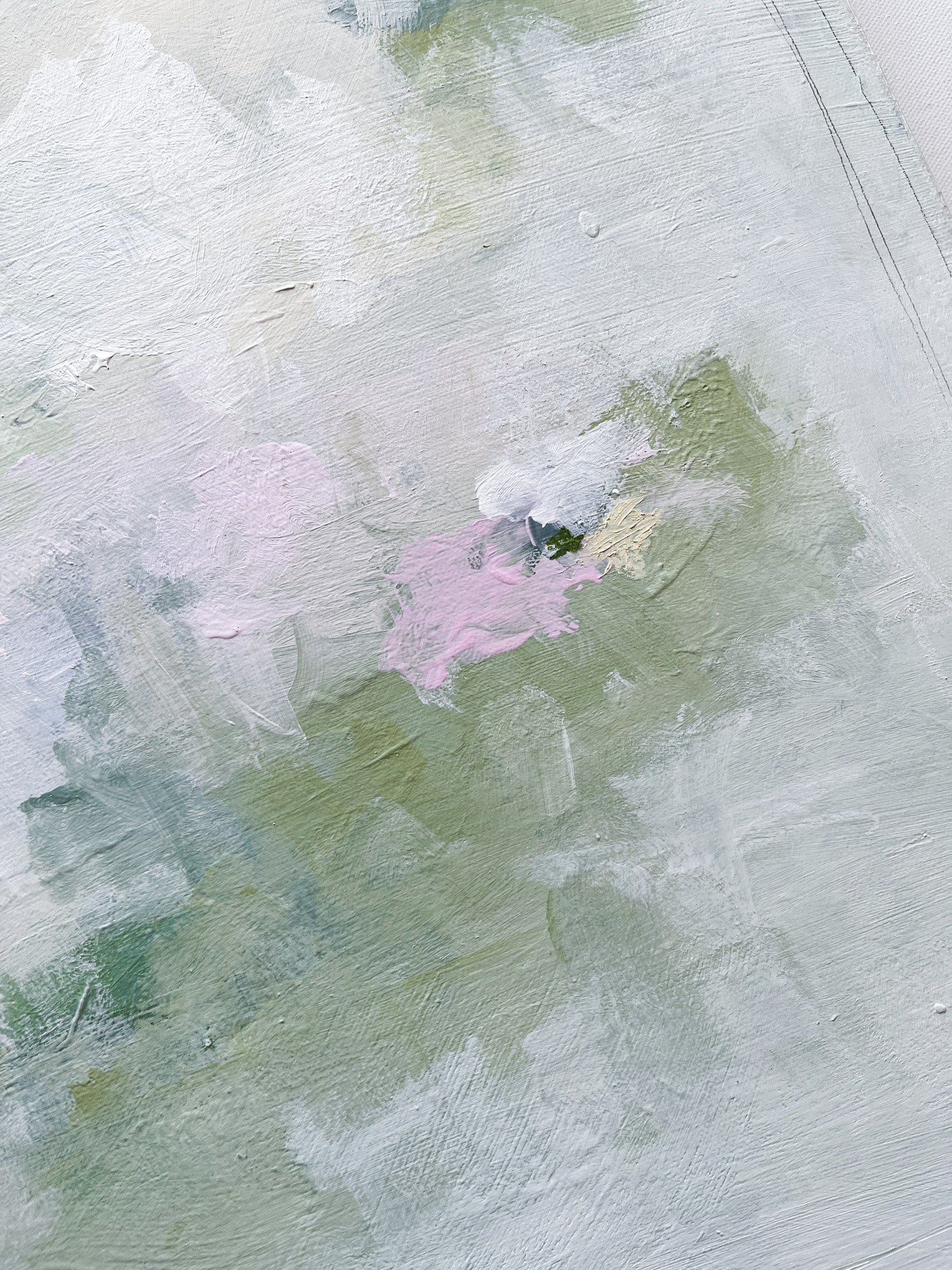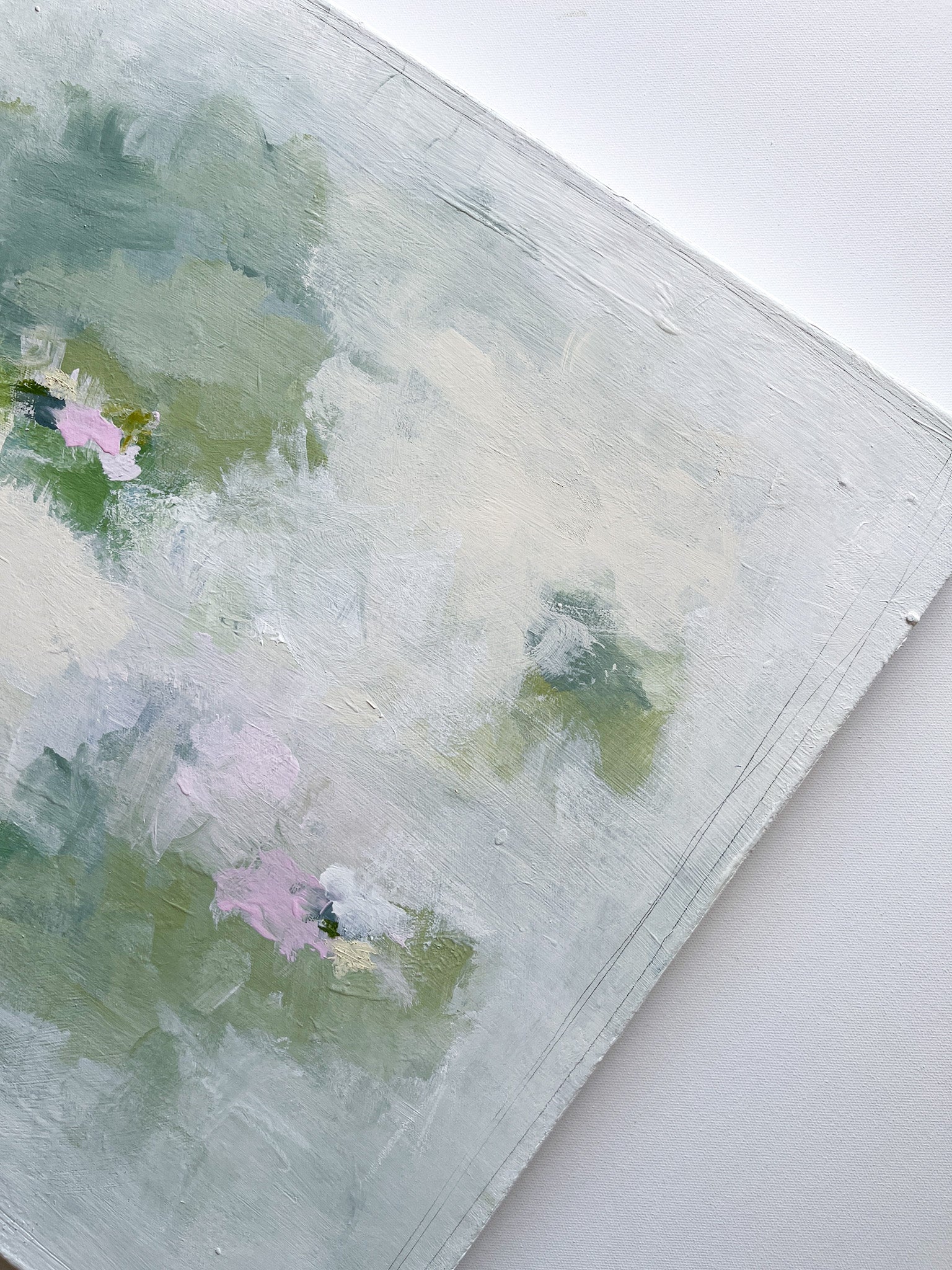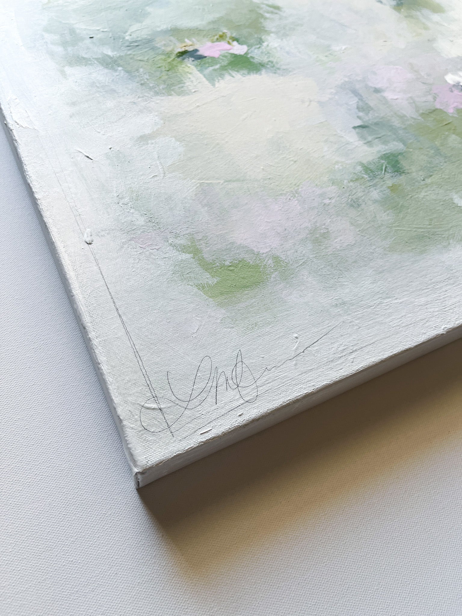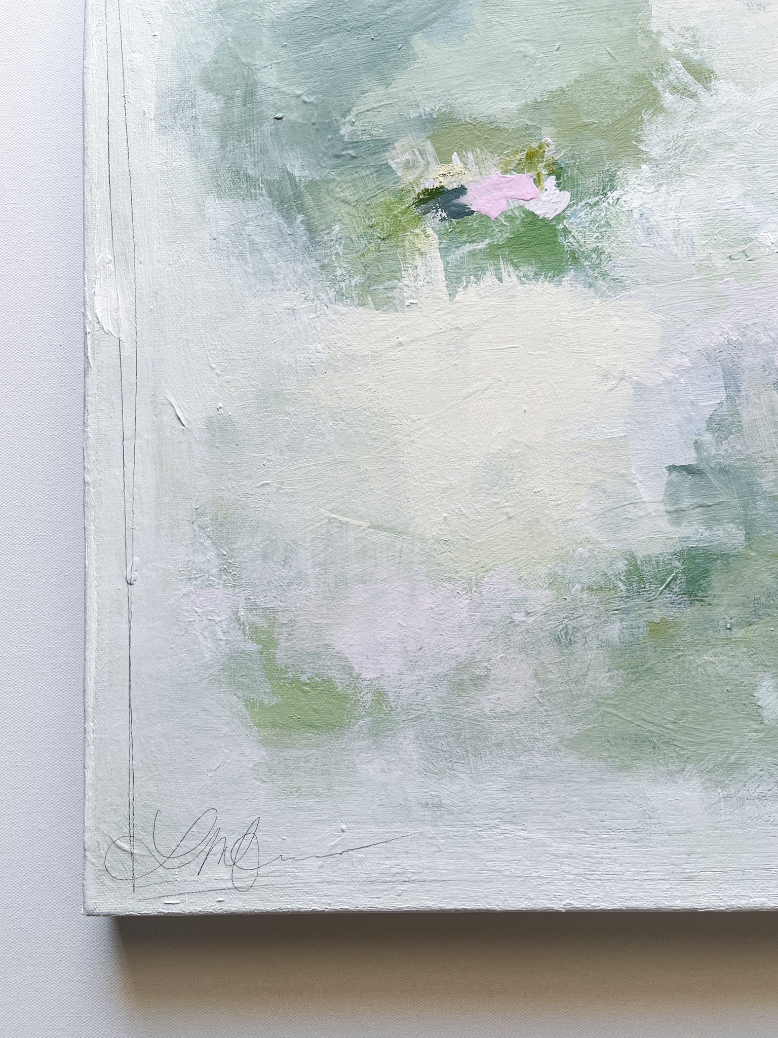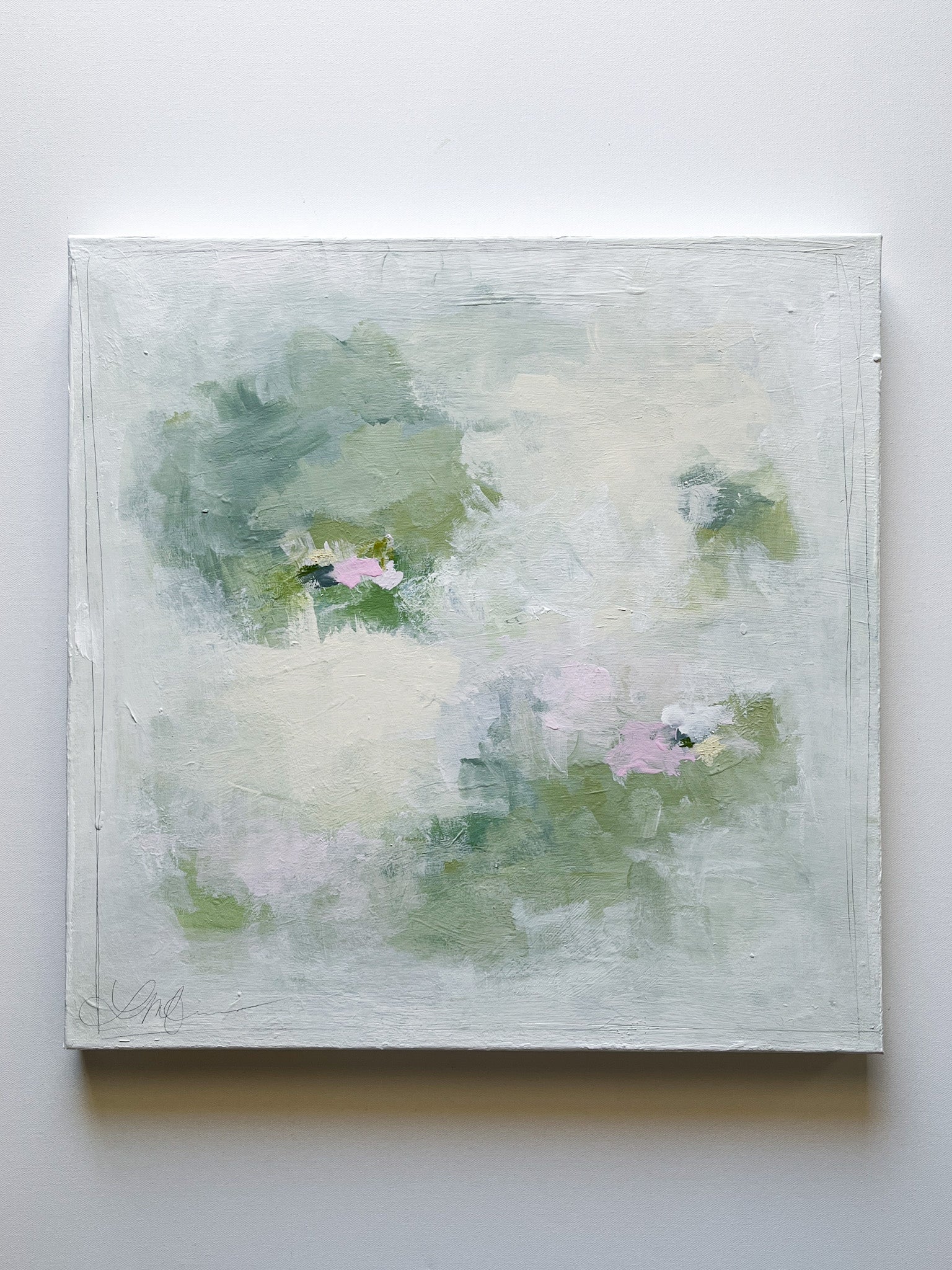 Mixed media (acrylic, oil and graphite) on 20x20 gallery wrapped canvas. Signed on front corner, titled and signed on back. Wired and ready to hang.