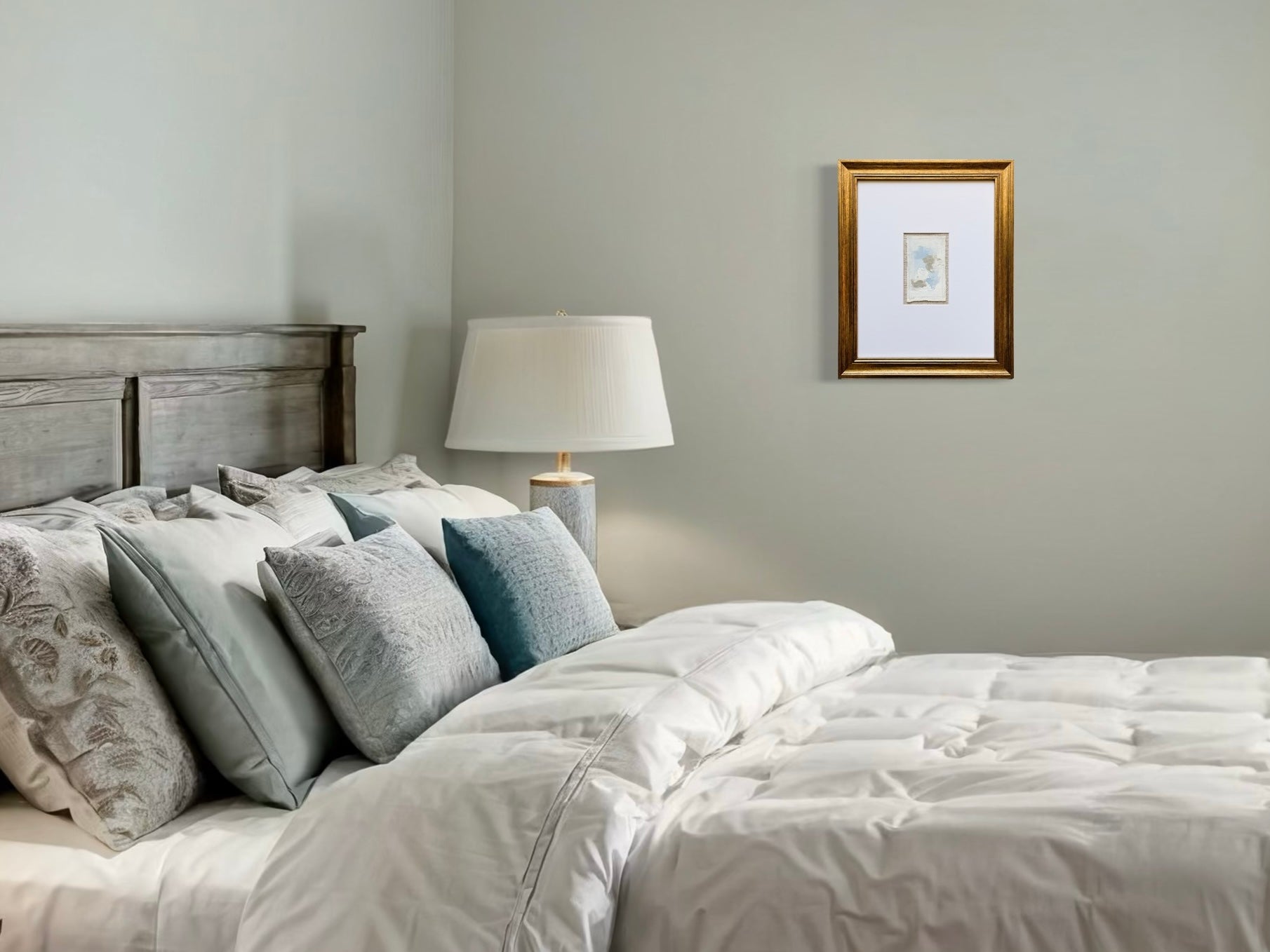 Details: Framed in vintage gold frame with glass front, matted on linen blend fabric in the color Sand, bright white 11x14 mat with 4x6 opening.