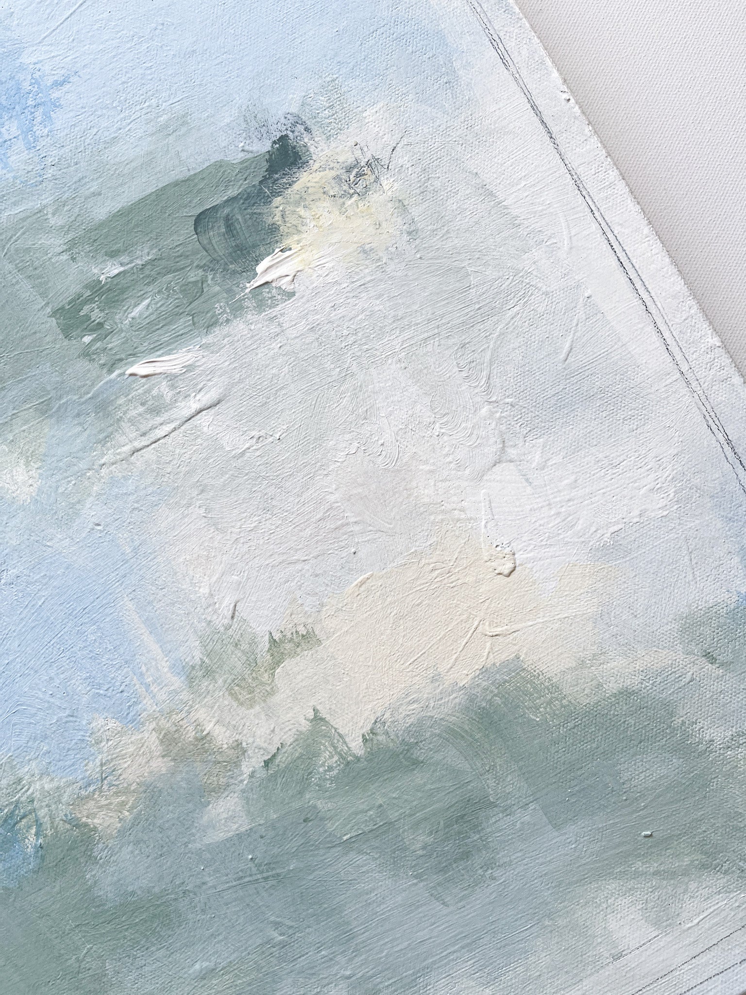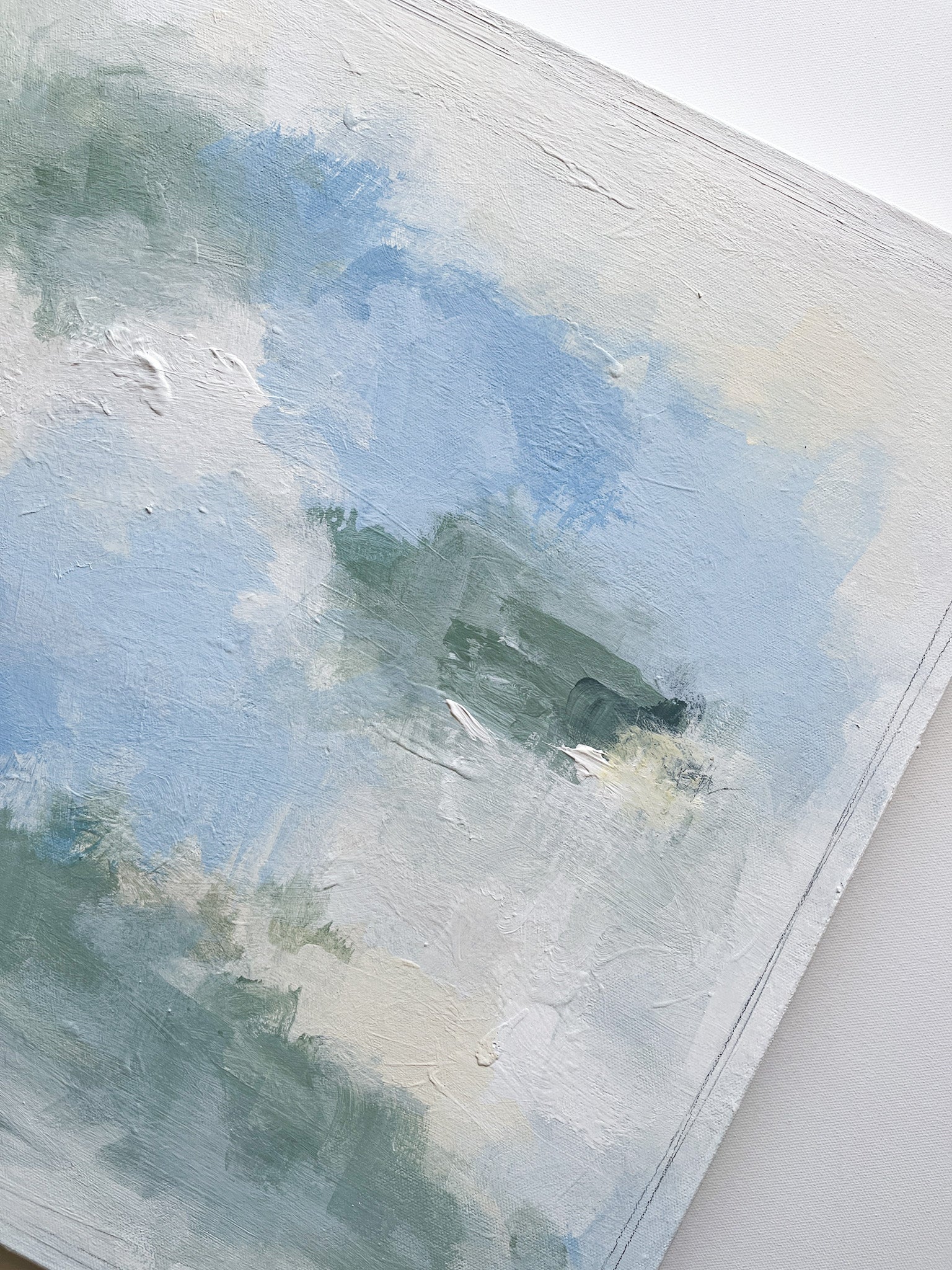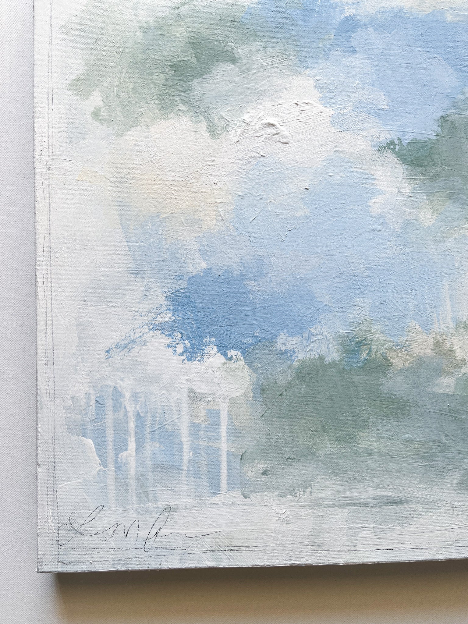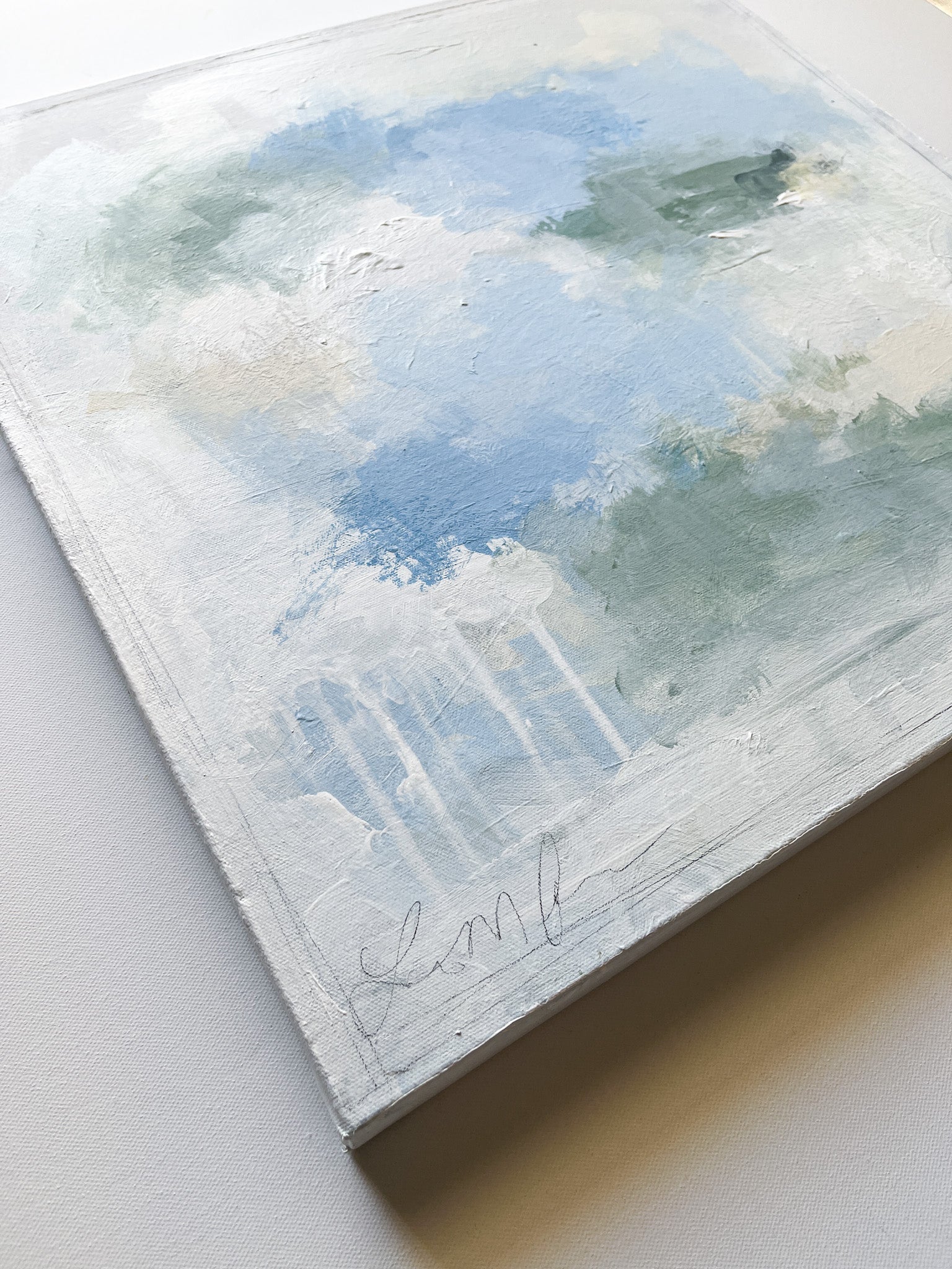 Mixed media (acrylic, oil and graphite) on 20x20 gallery wrapped canvas. Signed on front corner, titled and signed on back. Wired and ready to hang.